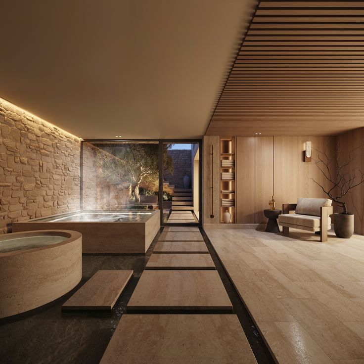 Material specification rounds out the picture. Cold water, condensation, and splash are hostile to many finishes that read as high-end. Surfaces in the immediate surround must tolerate sustained moisture without degrading: stone, marine-grade teak, sealed concrete, or engineered composites. Getting this wrong produces a suite that photographs beautifully on launch day and looks tired within eighteen months. And footprint discipline matters throughout: in practice, the most successful installations occupy a footprint comparable to a large bathtub, with chiller and filtration housed in an adjacent cupboard, beneath a platform, or in a service corridor. Integration is the design discipline: making the plunge feel native to the room rather than imposed on it.