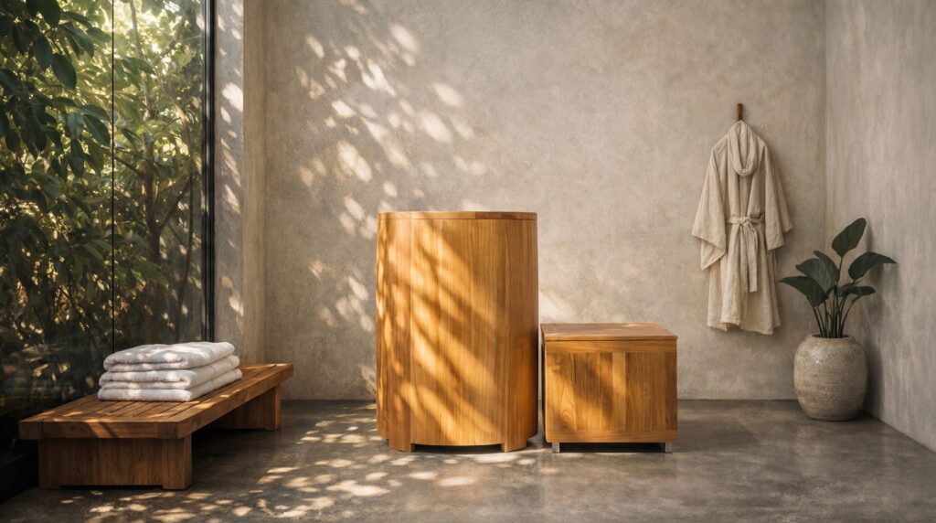 Between the permanent build-out and the portable kit sits an approach now common in Asia-Pacific hospitality: purpose-designed cold plunge hardware integrated into suites with concealed mechanical systems. At Rekoop Flex in Singapore, two Barrel-format cold plunge tubs sit within curved private suites, with chillers concealed beneath custom decking, invisible to the guest. Each suite reads as a designed environment, not a treatment room. Guests see teak and water and morning light. Engineering sits underneath.
